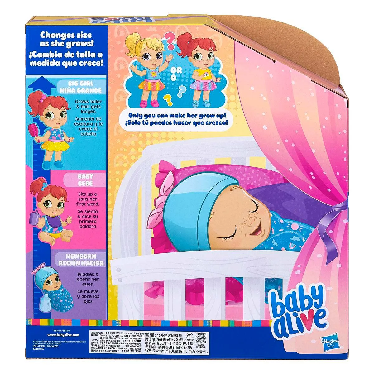 ¡Ella crece DE VERDAD! La muñeca Baby Grows Up de Baby Alive cambia de recién nacida a bebé y de bebé a niña grande. De hecho, con tus buenos cuidados, crecerá 10 cm.
