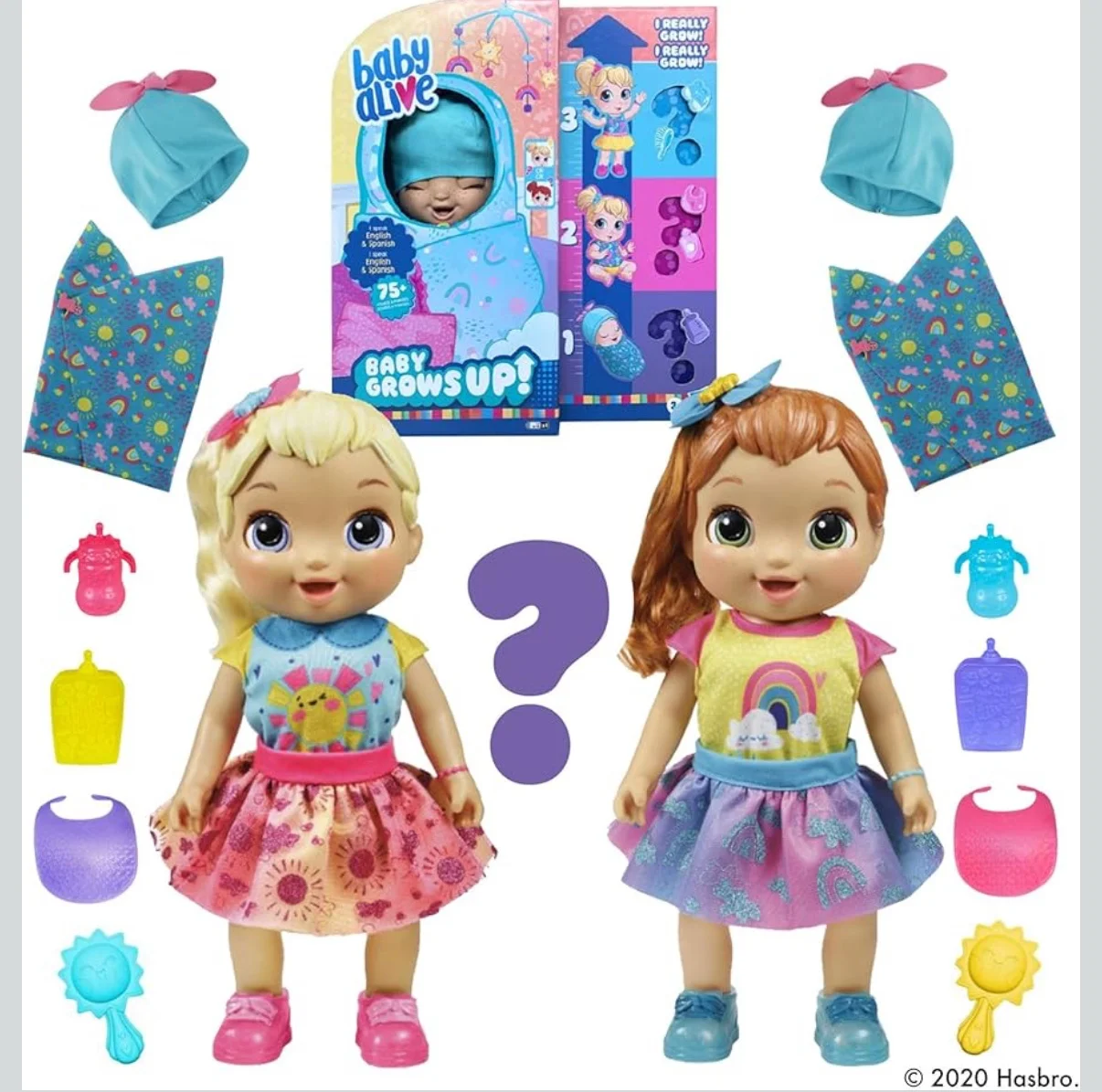 Mientras es bebé, la muñeca Baby Grows Up de Baby Alive se sienta y dice su primera palabra. Ayúdala a crecer dándole de comer su comida para muñeca y jugando con ella.
