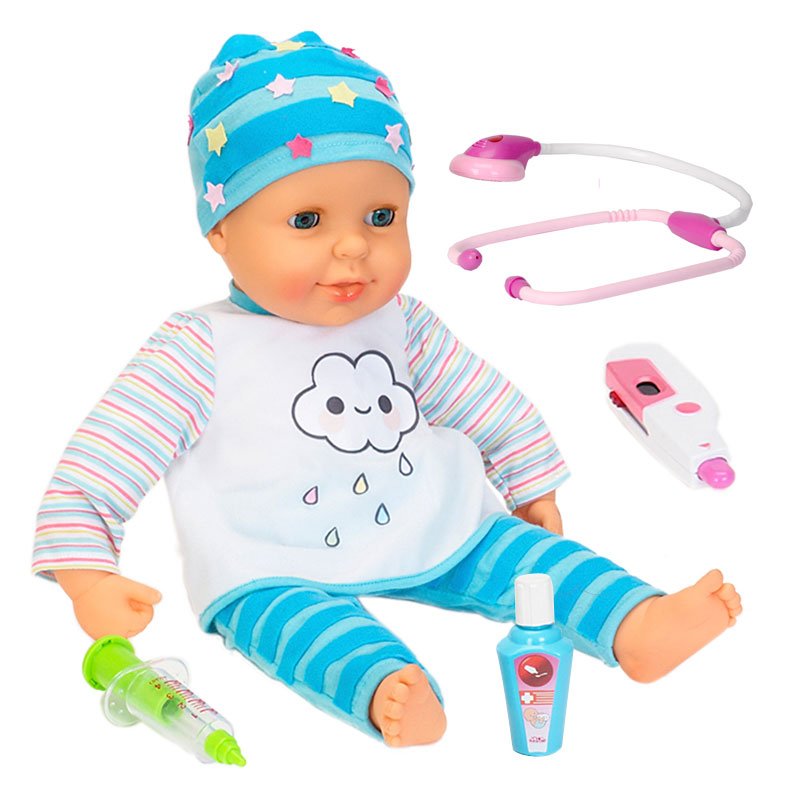 El set incluye varios accesorios médicos que enriquecen la experiencia de juego: un estetoscopio para escuchar el corazón, un termómetro para comprobar la temperatura, una jeringuilla y un bote de jarabe.