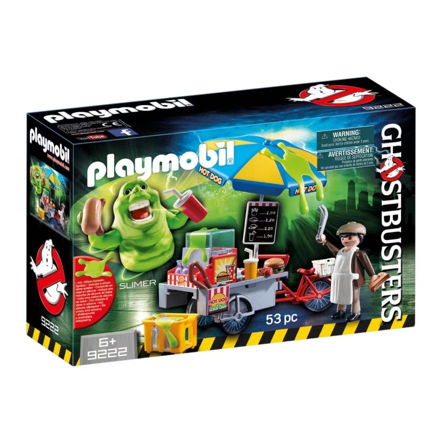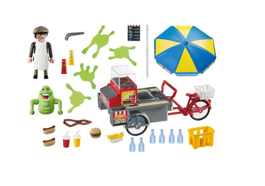¡Han vuelto! ¿A quién vas a llamar? … El fantasma verde Slimer y un personaje con su puesto de perritos calientes.