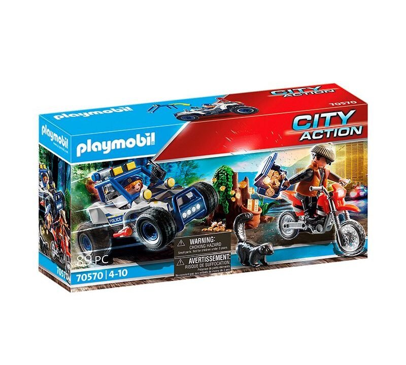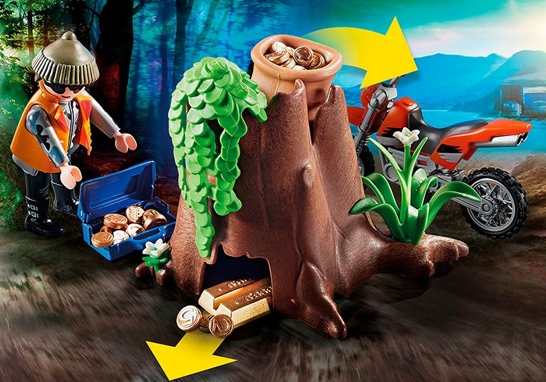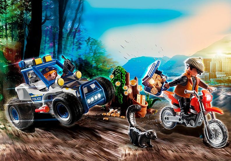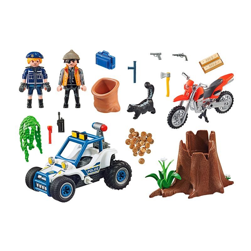 El set de juego contiene dos figuras de PLAYMOBIL , una moto de motocross, un coche de policía todoterreno, un árbol hueco, una mofeta, monedas de oro, pistolas y muchos otros accesorios.